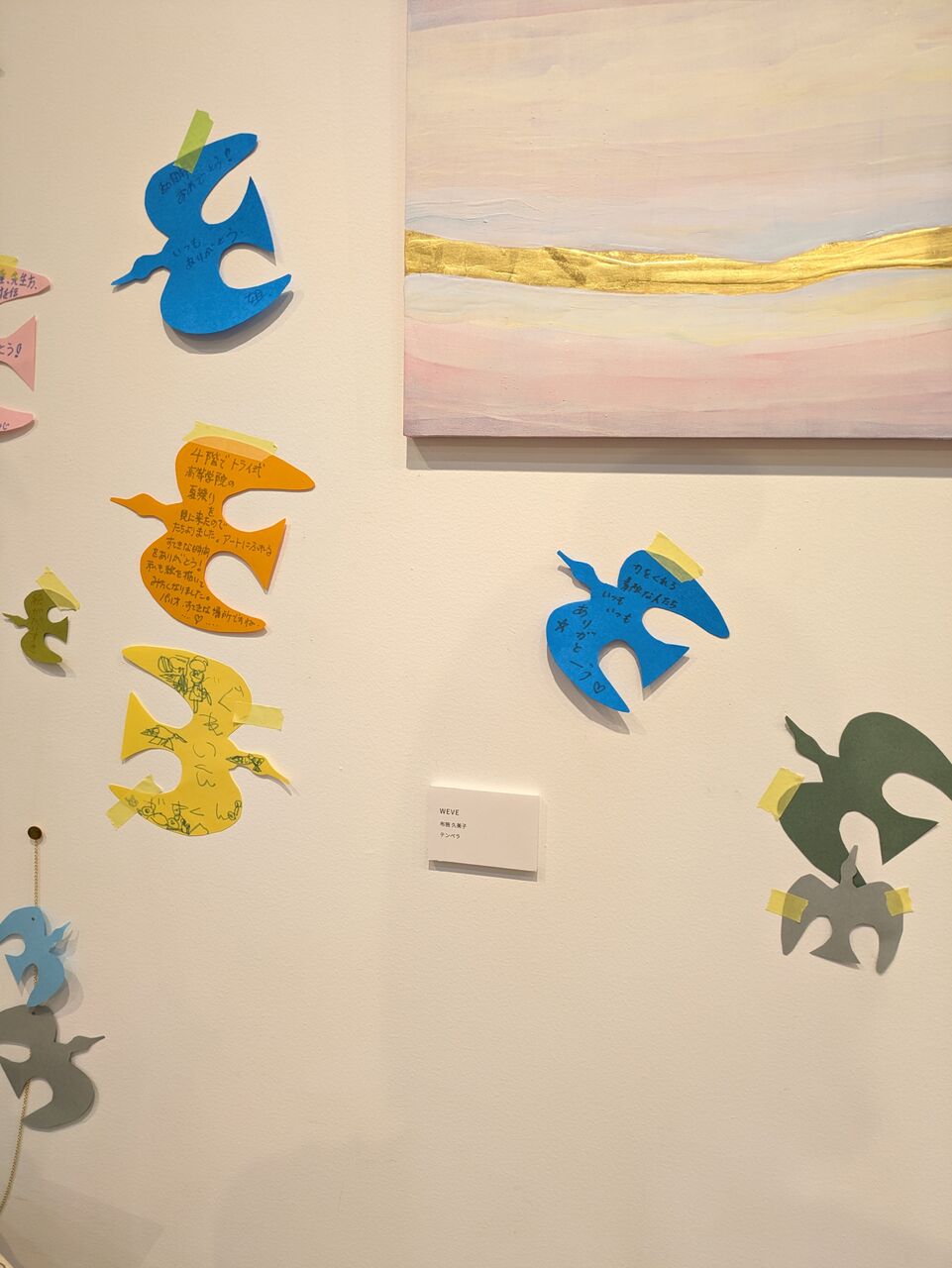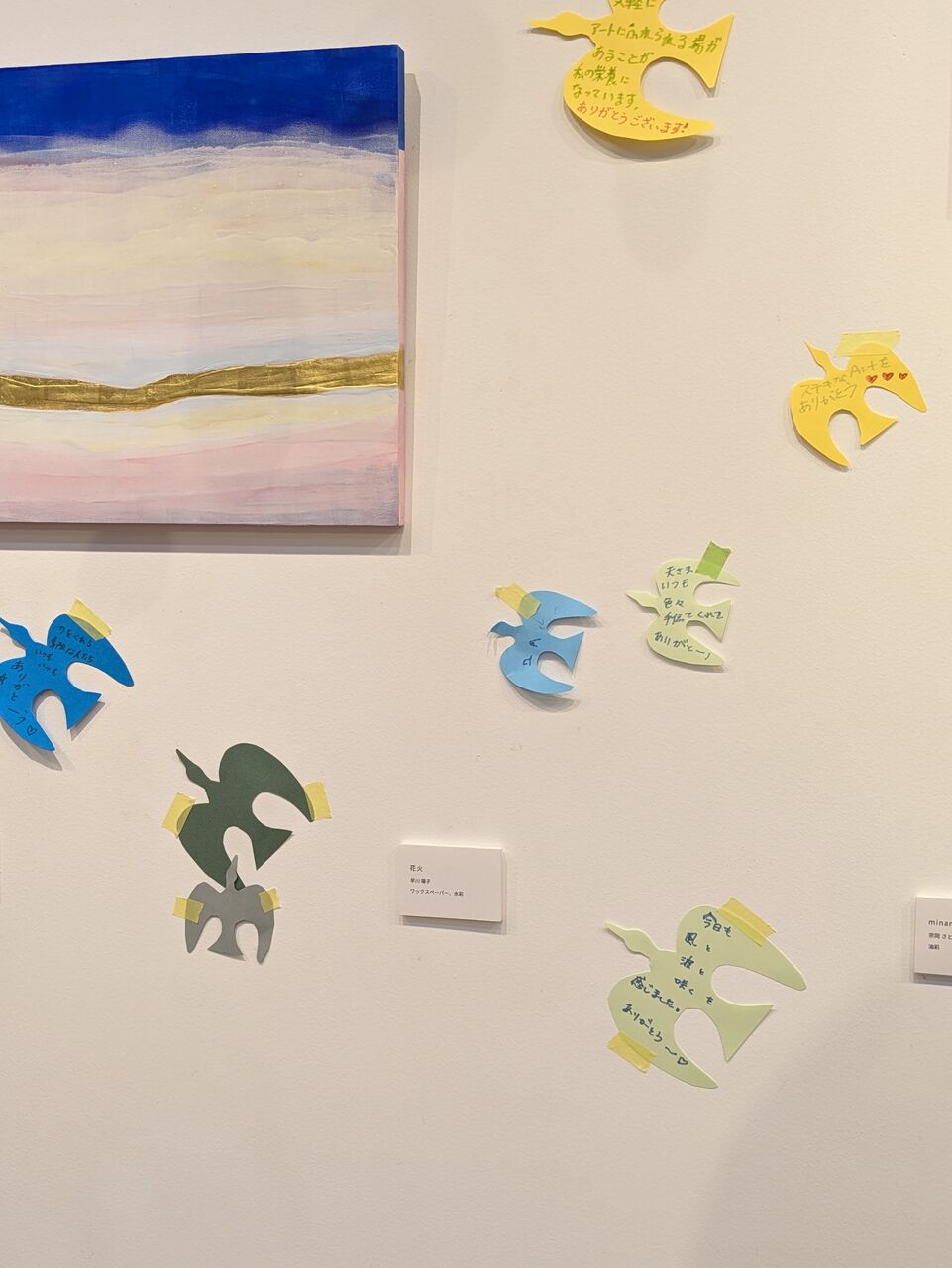 今回はそれぞれの作品の周りにご来場して頂いたお客様からメッセージを書いて貰った鳥の形の紙を貼ったり吊るしたりしてもらう、という参加型の展示にしました。