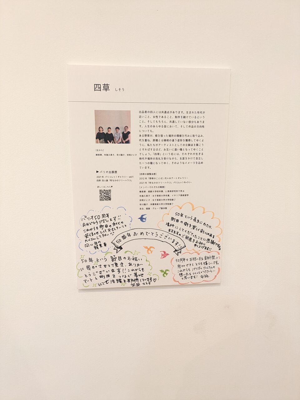 ミーティングの時に何か来場してくれたお客様も参加できるものをやりたいね、なんてぼんやりとした案を上げてから、具体的なパリオバードの紙にメッセージを書いて吊るしたり貼るという道具や細かい所まで詰めてくれたのはメンバーの早川陽子さんです。どういうメッセージにするかは皆で考えましたが、細かい展示方法など